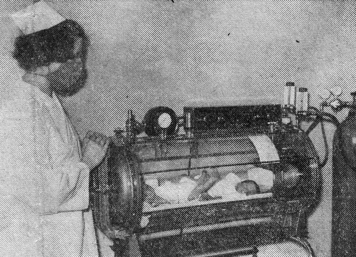 1951: On June 18, 1951, Stanley Warren and Carmen Marie Rhea became the first twins born at the Hospital. The Houston twins were pictured here with nurse Charlotte Huffman in a new air-lock incubator, designed to assist newborn breathing.